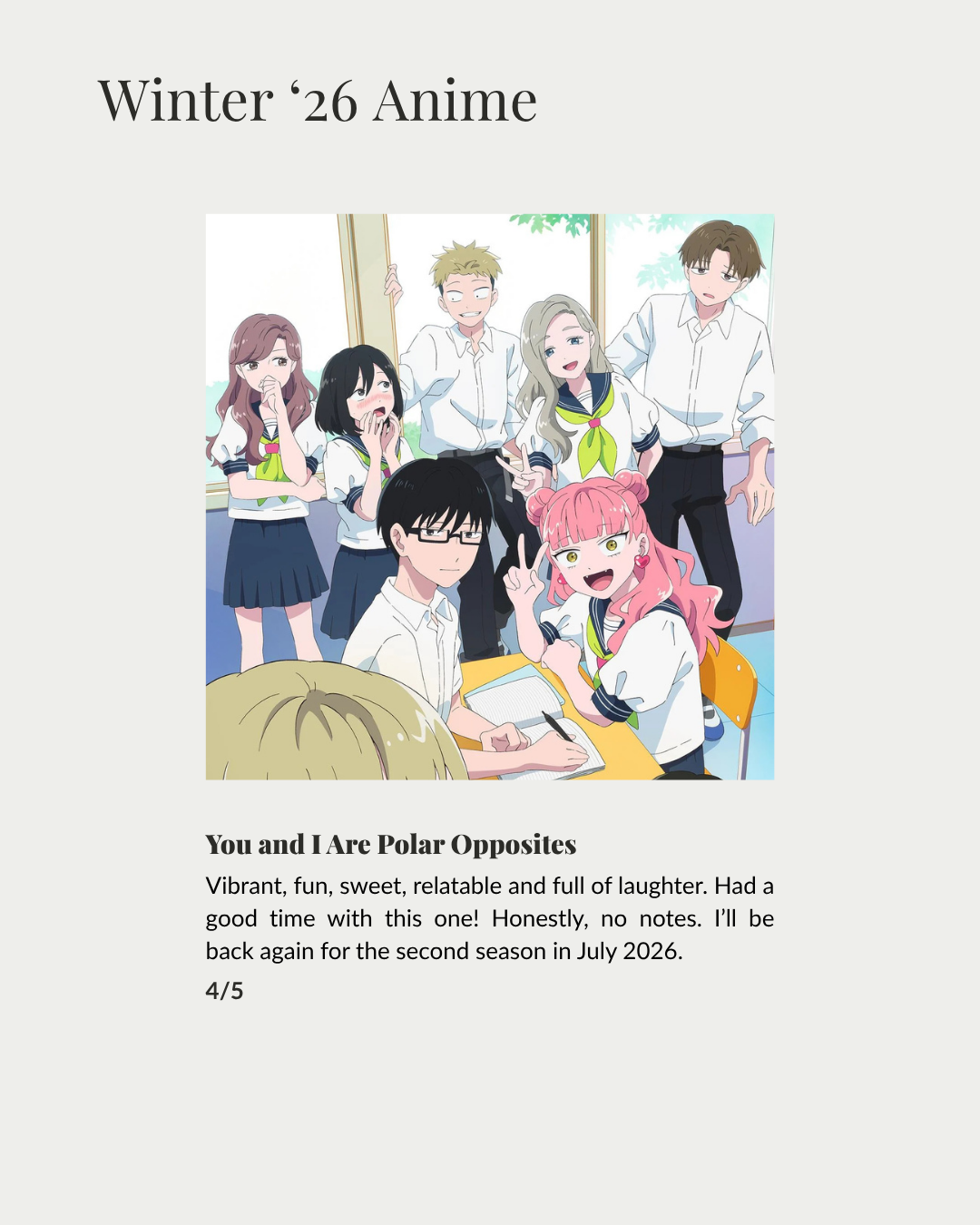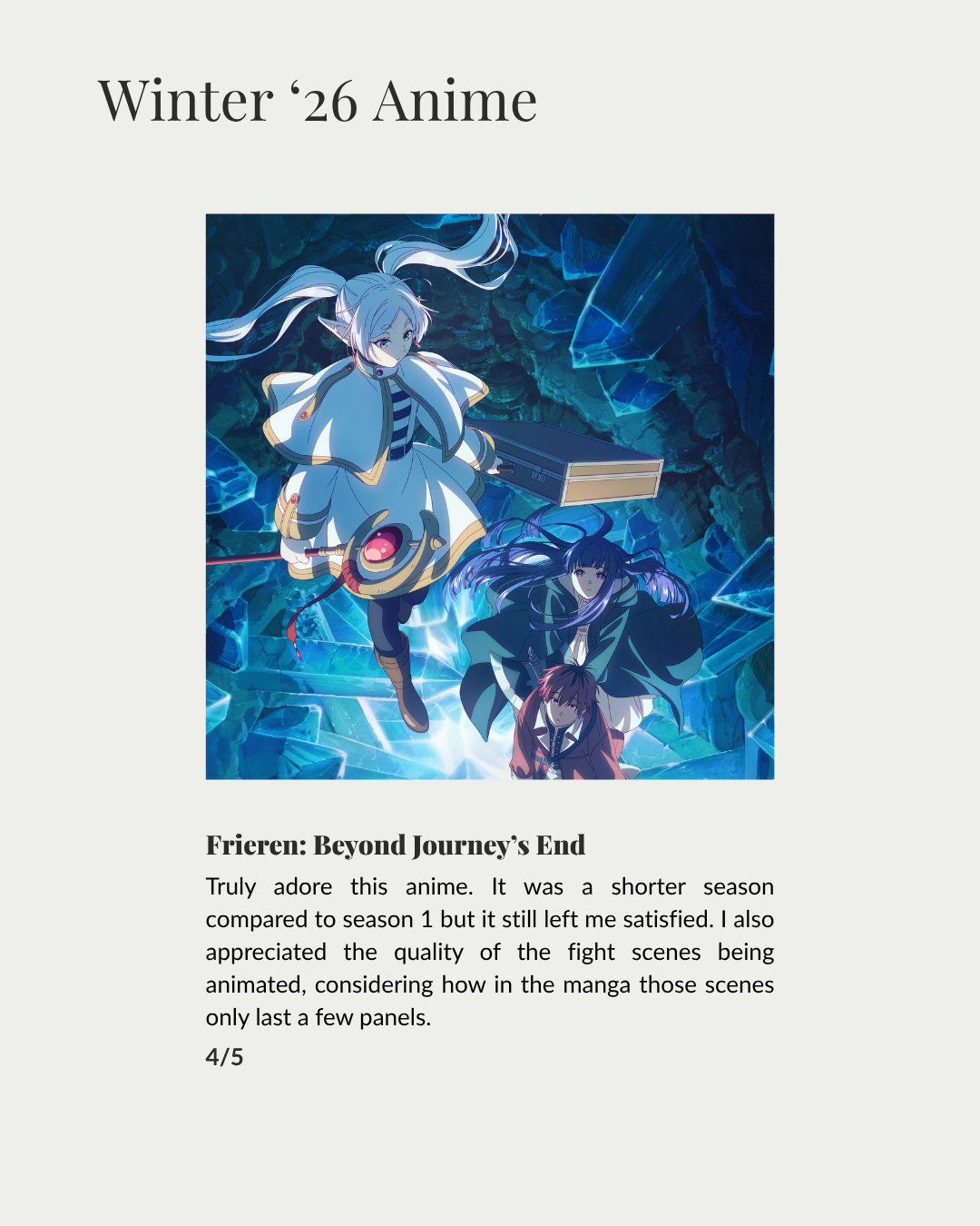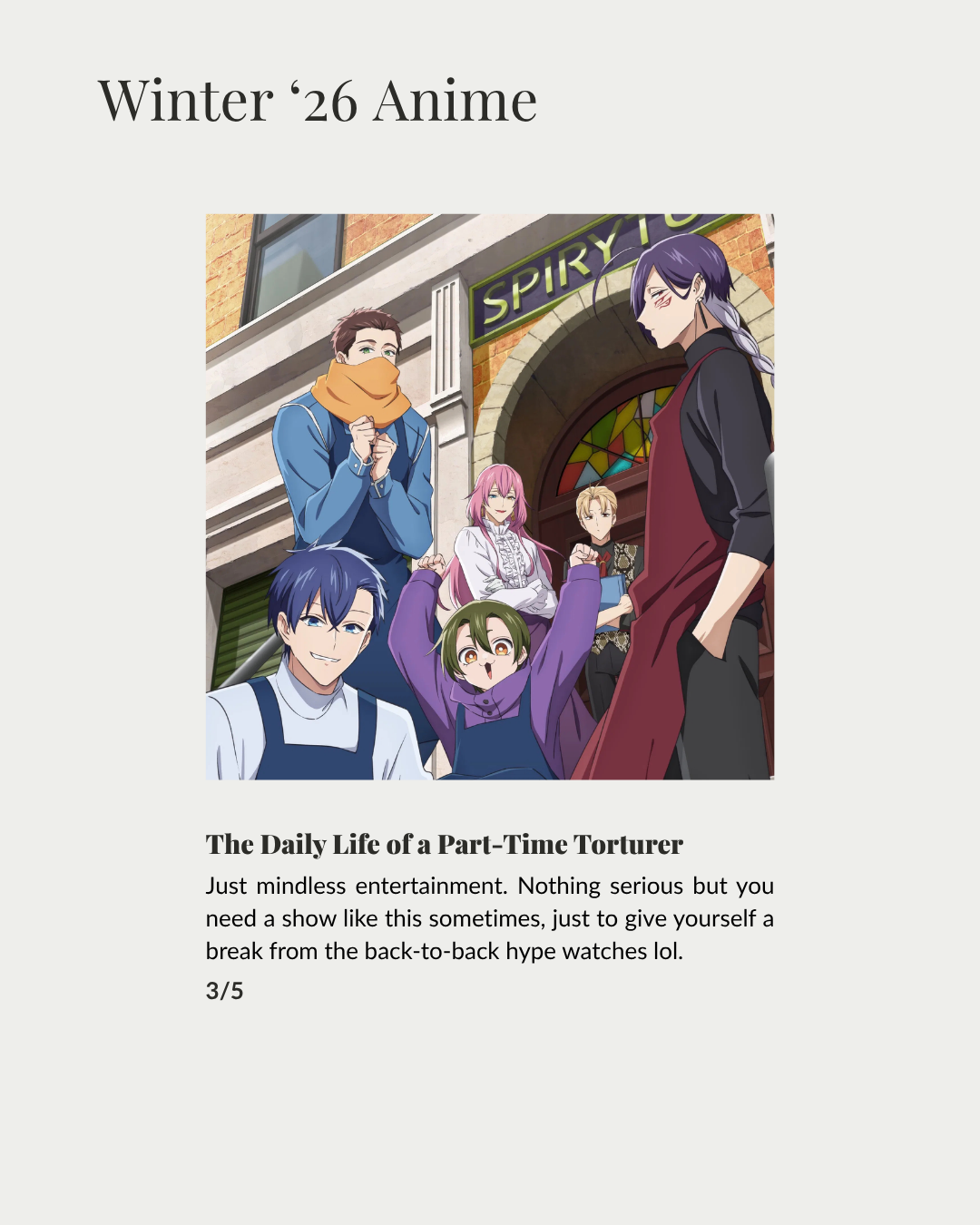 Hello, hi my lovelies! March’s media log won’t be as extensive as the previous month’s as I was so busy dealing with life. And, it was mostly spent on rounding up my winter ’26 anime as the season comes to an end, enjoy!